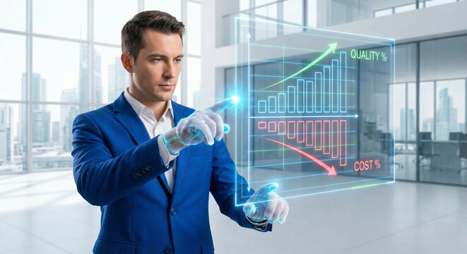 An executive man is confidently manipulating a dynamic holographic graph, highlighting the concepts of progress.