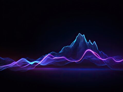 Abstract neon glowing digital soundwave mountains on a dark background