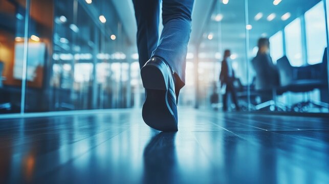 Business meeting in modern office professional walking indoor environment low angle view for dynamic engagement