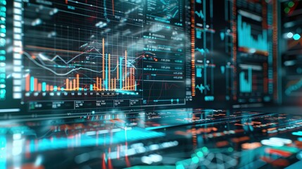 close-up of multiple computer monitors with futuristic and dynamic AI-based data visualizations, charts, graphs, holographic displays showing market trends or financial analytics