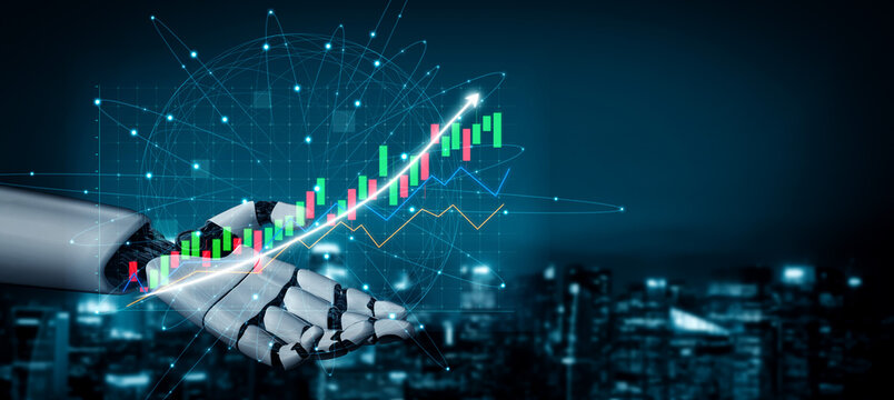 A futuristic robotic hand presents dynamic financial trends through glowing charts against a city skyline, symbolizing technology impact on finance. Impute