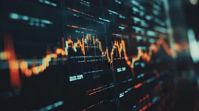 Financial dashboard displaying candlestick and bar charts with market analytics overlays