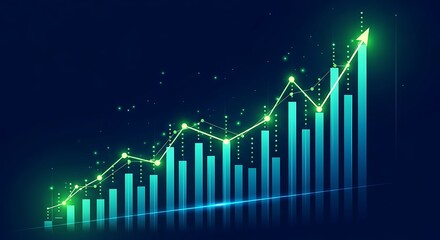 Abstract illustration of an upward trend graphic showcasing a growth in data represented by vibrant bars and a glowing curve against a dark background.