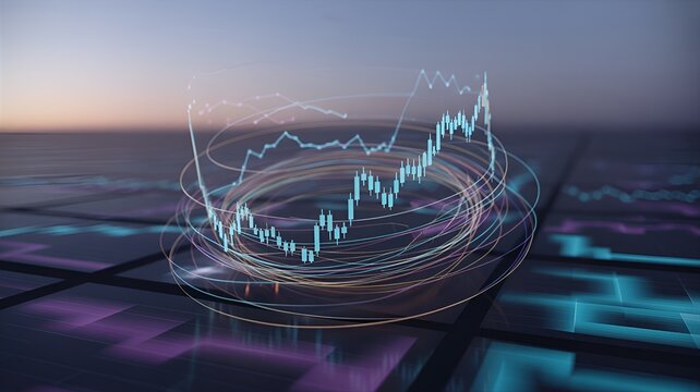 A dynamic visualization of financial market data. Candlestick charts illustrate stock price fluctuations, showcasing upward trends and potential investment growth opportunities. Data analysis tools ar