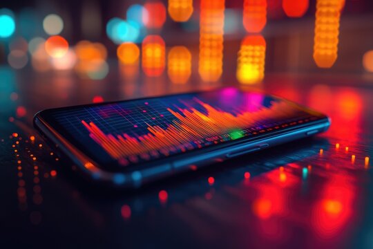 Smartphone Displaying Vibrant Stock Market Chart with Blurred City Lights in Background