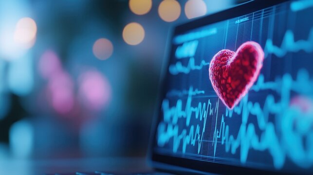 Beating heart rhythm and vital signs displayed on a digital medical monitor or dashboard screen with abstract data charts graphs and financial analytics in a dark futuristic technology background