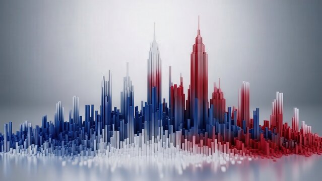 Dynamic 3D bar chart visualization with red and blue glowing lights, representing data growth and financial analysis in a modern tech environment.