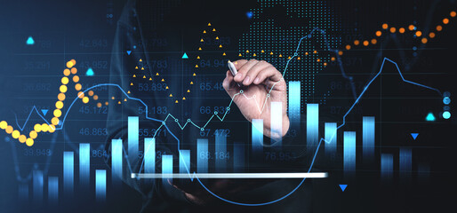 Hand drawing financial charts and graphs with dynamic holographic elements on a dark background. Concept of market analysis and investment.