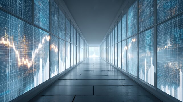 Futuristic hallway with digital screens showcasing dynamic financial data and stock market trends
