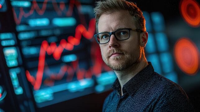 A man wearing glasses is captured in a moment of surprise while looking at his smartphone screen, against a backdrop of financial graphs displaying fluctuating patterns.