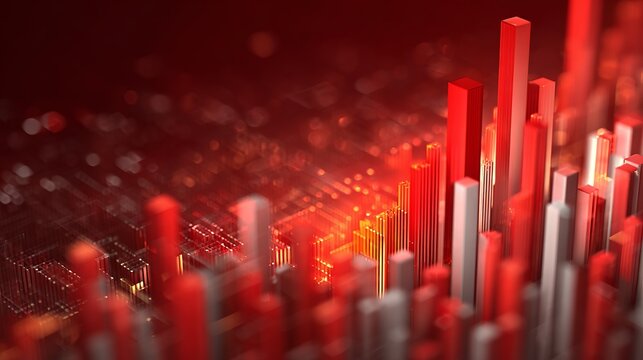 Dynamic 3D abstract data visualization with glowing red and white bars suggesting growth and financial success in a modern tech landscape
