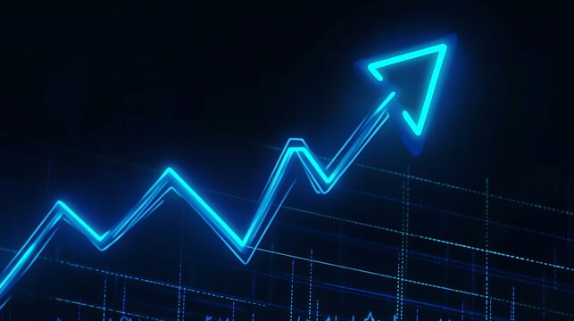 Neon blue arrow on an upward-trending graph, symbolizing business growth and stock market technology. Illustration with detailed renderings on a black background.