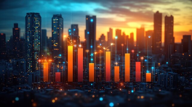 Urban Skyline with Dynamic Financial Growth Charts at Sunset