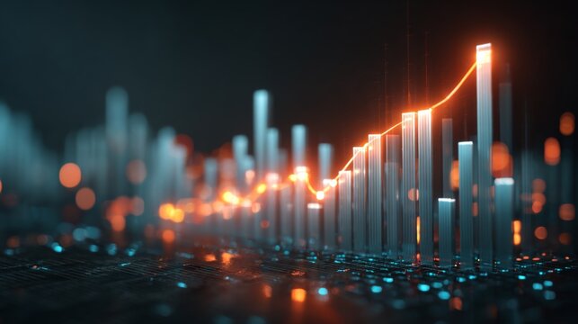 Abstract representation of financial data with glowing bars and rising graphs depicting market trends and analytics in a modern digital environment
