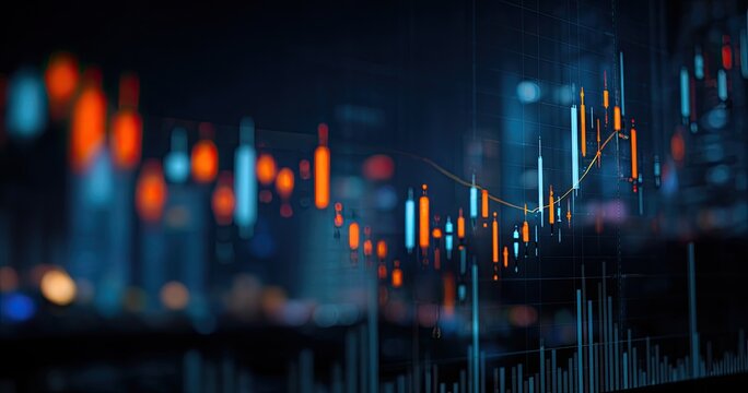 Abstract nighttime cityscape backdrop with overlaid dynamic financial charts displaying fluctuating stock market data in orange and teal