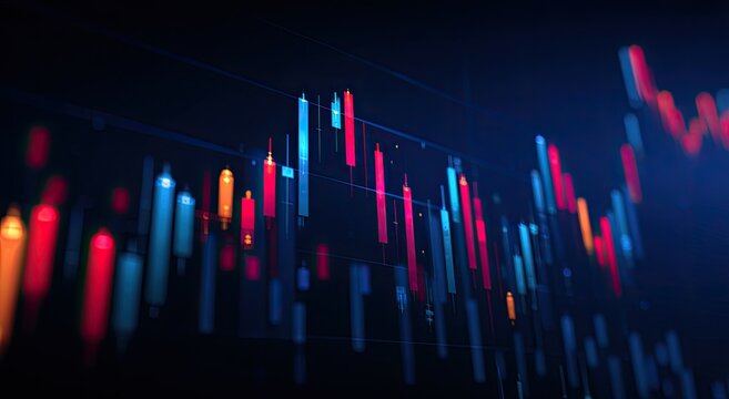 Dynamic futuristic 3D candlestick chart displaying financial market volatility on a dark digital screen. Technology concept