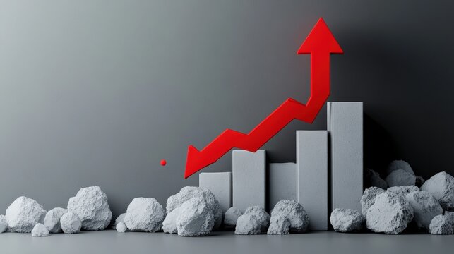 Abstract representation of growth with rising bars and a red arrow on a gray background