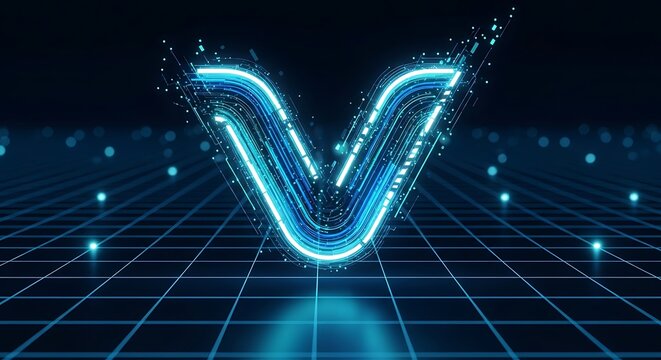 Dynamic digital 'V' symbol, illuminated with vibrant blue light trails, against a futuristic grid backdrop, embodying innovation and advanced technology in the digital realm.