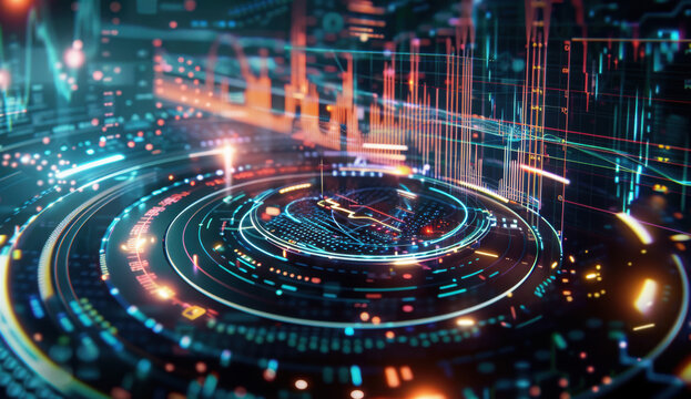 A high-tech financial dashboard interface showing dynamic data with a clock element, ideal for technology backgrounds.