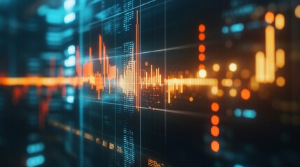Abstract digital data visualization showing dynamic financial charts and graphs with vibrant blue, orange, and red hues, ideal for technology, finance, and business concepts. : Generative AI