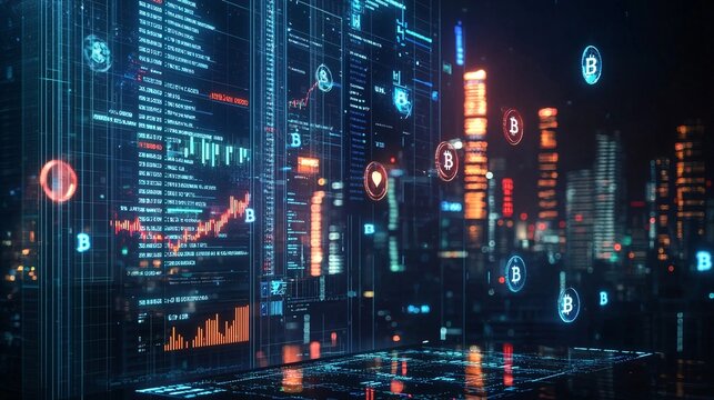 Financial data processing on futuristic digital screens
