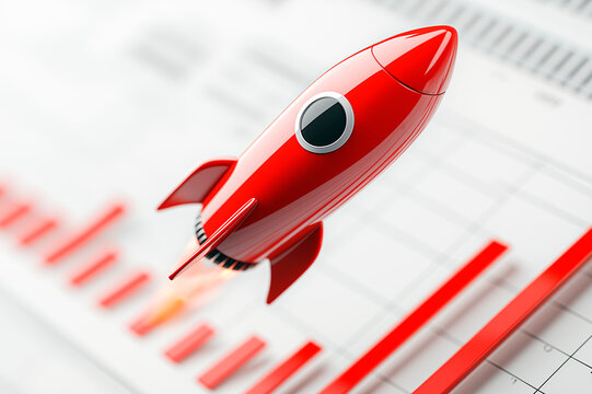 A golden rocket launching over a digital stock market chart, representing rapid growth, technological advancement, and the surge in financial markets or digital investment.