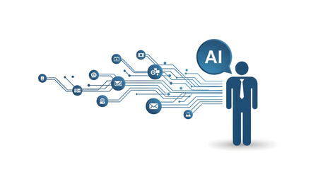 Modern AI integration with faceless businessman for future tech solutions and innovation, embodying business automation and dynamic digital transformation on isolated white background.