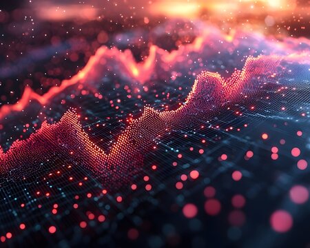Red digital landscape with glowing grid and data points. Visualize stock market trends or network activity. Perfect for tech presentations or financial reports.