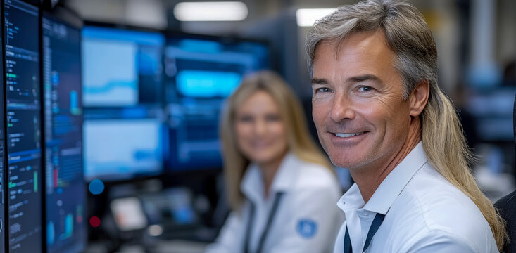 In a dimly lit control room filled with large digital screens, a diverse group of professionals analyzes complex data, focused on their tasks during the evening