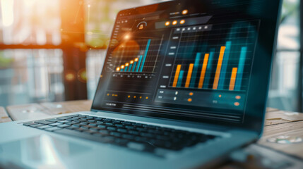 A laptop displaying various dynamic bar and line charts, highlighting financial and business analytics in a brightly lit office environment.