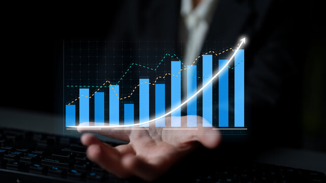 A businessman displays a growth graph with dynamic data visualization, symbolizing financial success and strategic planning in a modern office setting. Impute