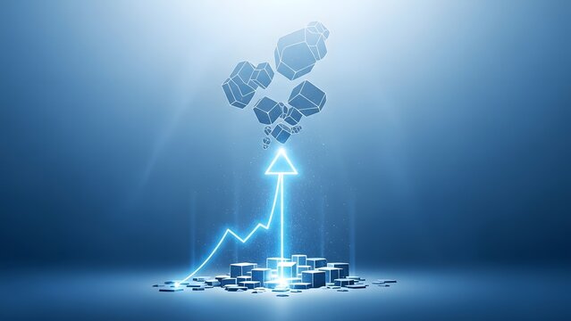 Conceptual digital growth visualization glowing line graph arrow and geometric polygonal structures against blue background