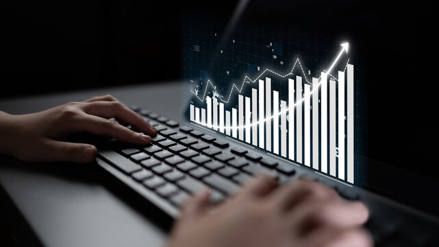 Modern hands typing on a sleek keyboard, with a dynamic data graph projection showcasing growth and financial analysis, illustrating digital work environments and insights. Impute