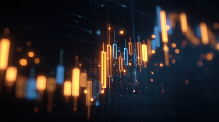 Dynamic financial chart displaying vibrant candlestick patterns and glowing data points, representing market trends and analysis in digital environment