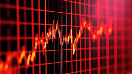 A dynamic graph displays fluctuating data trends in striking red against a grid background, suggesting volatility or analysis in financial markets.