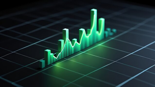 A dynamic financial chart showcases fluctuating green bars against a sleek black grid background representing market movements and economic trends in a digital setting.