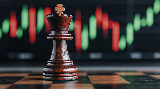 A wooden chess king stands prominently on a chessboard, with a blurred background featuring green and red financial graphs.