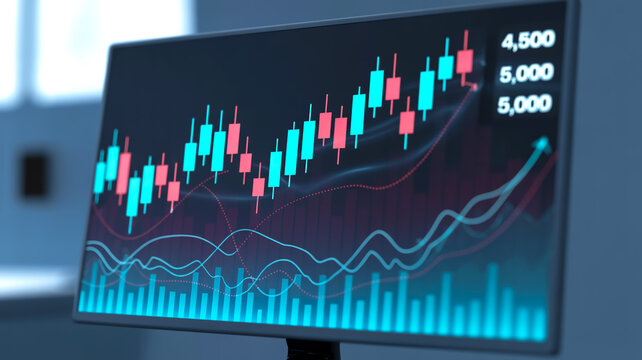 Digital forex market screen displays financial charts, diagrams. Candlestick patterns, investment growth evident. Investment strategy, stock market trends visualized. Dynamic 3D rendering for