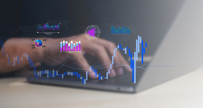 A close-up of hands typing on a laptop with overlaid dynamic financial charts and graphs indicating data analysis or stock market trends.