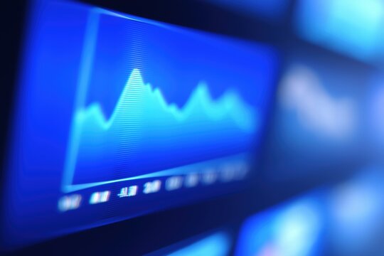 Market analysis and financial data visualization with stock chart trends, showing digital technology impacts on investment decisions and trading strategies.