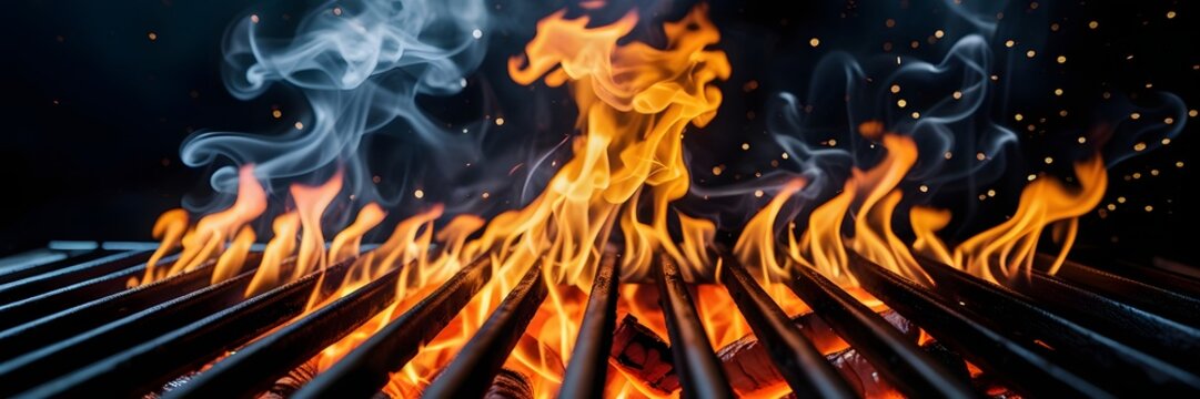 Close-up flaming charcoal grill showing bright flames for outdoor barbecue cooking