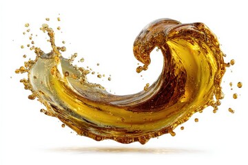 Golden liquid splash in swirl shape, flowing motion with vibrant drips isolated on a white or transparent background showcasing fluidity and dynamic movement