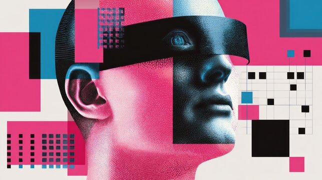 Futuristic Cityscape Architectural Abstract with Geometric Patterns and Cubes in Vibrant Blue and Red Tones