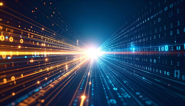 Digital data stream glowing light speed abstract background.