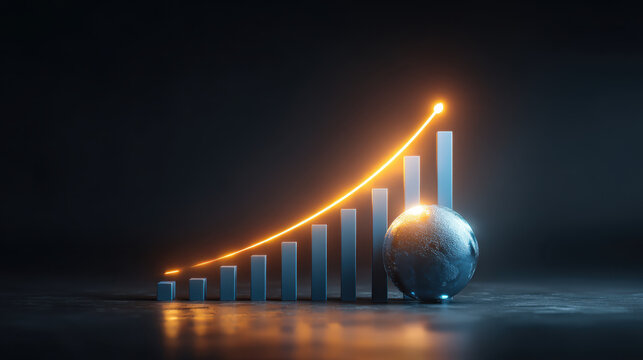 3D illustration depicting rising bar graph alongside globe, symbolizing global growth and progress. bars are illuminated with warm glow, creating dynamic and optimistic atmosphere