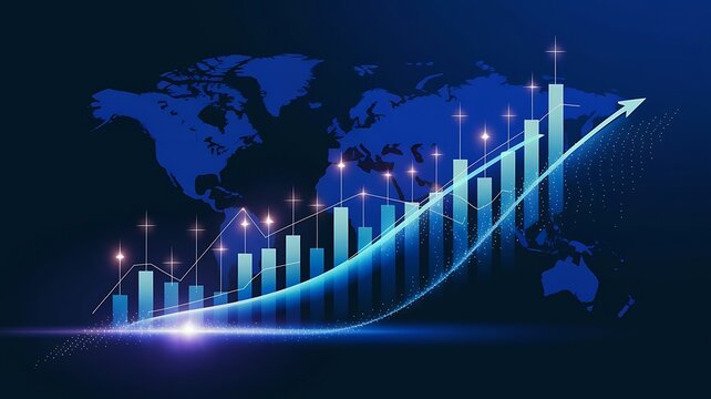 A captivating digital graphic representing financial data through a dynamic graph, highlighting global market trends and growth in a futuristic context. Impute