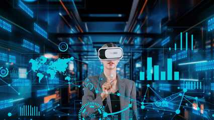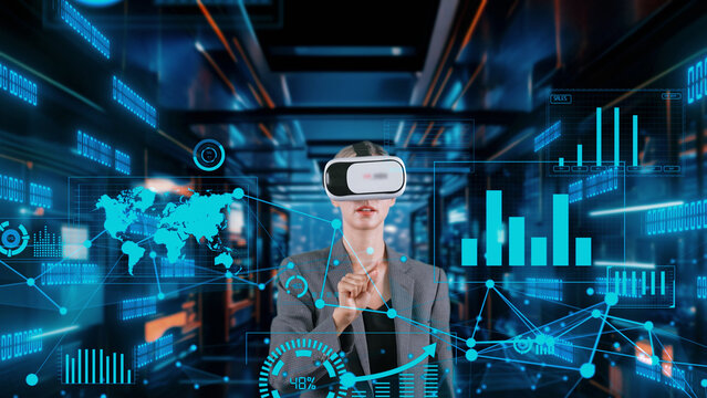 Woman wearing VR looking through metaverse financial business data graph dynamic report innovation blue background upload global interface digital infographic network technology visual. Hallucination.