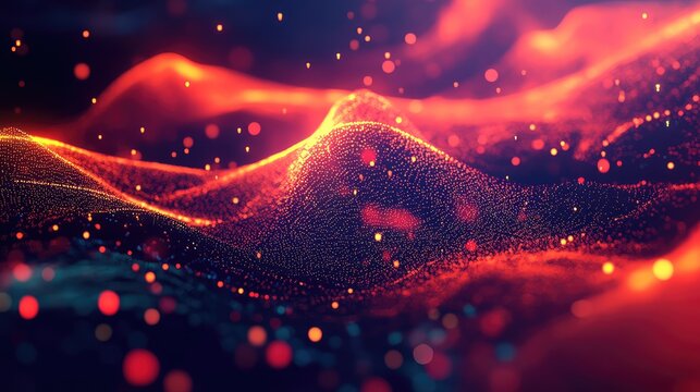 Glowing particles form undulating wave networks, visualizing flowing big data and digital information streams for technology, ai, quantum computing and futuristic connectivity concepts