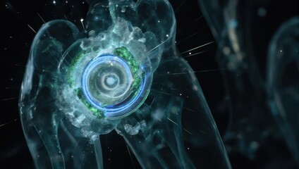 Abstract glowing blue and green spiral within a transparent biological structure.