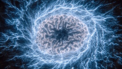 A glowing brain is encircled by electric energy within a swirling vortex of light